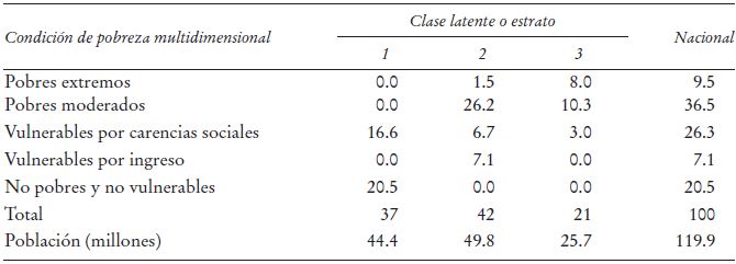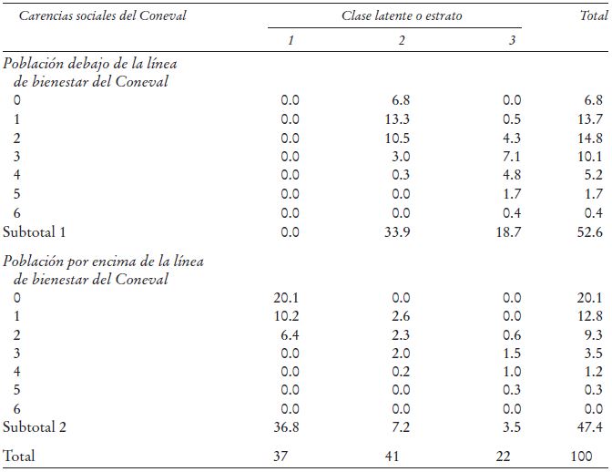 En síntesis, se puede observar que la estratificación en las tres clases in comento es bastante consistente, ya que la distribución del número de carencias y clases entre la población muestra el comportamiento esperado; es decir, en la clase latente 1 se concentra la mayor parte de la población con cero o una carencia y se ubica también toda la población por encima de la línea de bienestar; en la clase o estrato 2 se observa población mayoritariamente con una o dos carencias, y en la clase latente 3, aquella población con más carencias sociales. En estas dos últimas, la 2 y 3, se agrupa el total de la población por debajo de la línea de bienestar.