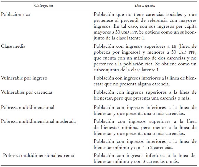 En ese sentido, el presente documento plantea y desarrolla la ubicación de las clases medias desde una perspectiva multidimensional, con las mismas dimensiones e indicadores utilizados por el Coneval (Consejo Nacional de Evaluación de la Política Social de México), organismo encargado de la medición oficial de la pobreza multidimensional en México. Las condiciones de vida se evalúan a partir del nivel de ingreso, como indicador de la dimensión de bienestar, así como de carencias en el plano denominado por el Coneval como los derechos sociales (y en otras metodologías, como necesidades insatisfechas):5 educación, salud, seguridad social, calidad y espacios de vivienda, acceso a la alimentación y servicios de vivienda. Ello permitirá, además de evaluar las condiciones de vida desde una perspectiva multidimensional, ser consistente con las dimensiones, los indicadores y los resultados de la pobreza oficial.