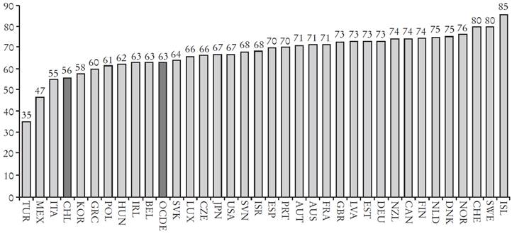 Chile es un caso interesante de estudio sobre la participación laboral de la familia, porque a pesar de las altas tasas de crecimiento observadas y la creciente modernización de la economía en las últimas décadas, la participación femenina en el mercado laboral es inesperadamente baja. Según la OCDE (2015), Chile es el cuarto país con menor participación laboral femenina entre los países pertenecientes a esta organización, con una tasa muy inferior a 63%, cifra que promedian los países de la organización. Si se compara Chile con economías de características similares, es decir, economías pequeñas abiertas, tanto emergentes como más desarrolladas, el resultado aún es peor; por ejemplo, Nueva Zelanda tiene una tasa de participación de 74%; Noruega, de 76%; República Checa, de 66%; Portugal, de 70%, etc. Sólo países como Turquía y México tienen tasas menores.