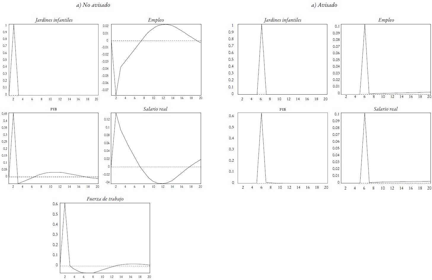 El objetivo de este ejercicio es medir la diferencia entre los dos casos sobre la economía de avisar o hacer inmediatamente efectivo el aumento en los servicios de jardines infantiles. La Gráfica 2 muestra las funciones de impulso-respuesta a un shock en el servicio de jardines en la economía de 1% para los casos mencionados en un horizonte de 20 trimestres. Se seleccionó un grupo de variables relacionadas con el mercado laboral (empleo, salario y fuerza de trabajo) y el PIB. Como indica la gráfica, el experimento 1 es equivalente a aumentar en forma exógena la demanda efectiva de jardines infantiles.