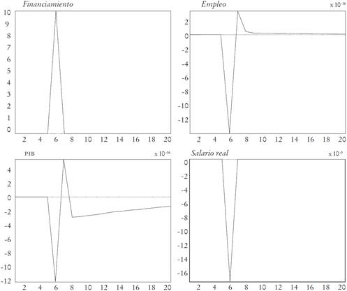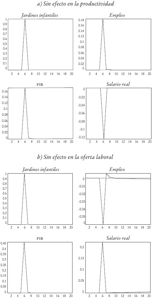 Para entender la manera en que un aumento en el servicio de jardines infantiles afecta la economía como un todo se realizaron dos experimentos, con base en funciones impulsos-respuestas. Estas funciones se pueden graficar a través del tiempo (en frecuencia trimestral) para describir cómo evolucionan las diferentes variables después de que ocurre el shock, es decir, la historia que está detrás de un cambio en los servicios de jardines infantiles, suponiendo que ningún otro cambio ocurrió en la economía.