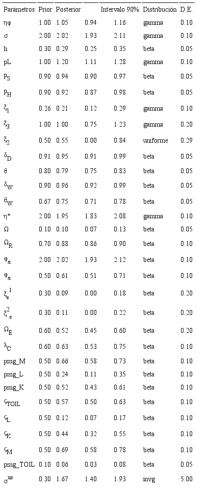 El modelo macro es estimado con econometría bayesiana, por lo que se deben establecer priors sobre la distribución de los parámetros (valores priors); luego, mediante técnicas econométricas estándares (máxima verosimilitud) y réplicas (simulación) se obtienen las distribuciones de los posteriores o estimaciones finales.4 La mayoría de los priors de los parámetros estimados se tomó de la literatura tradicional de modelos macroeconómicos (véanse Fuentes y García, 2014; García y González, 2014).5 Para asegurar la calidad de las estimaciones se realizaron dos estimaciones independientes (cadenas de Markov) con un número alto de réplicas y se observó que en ambas la distribución de los parámetros converge a valores similares (véase la parte 2 del apéndice).