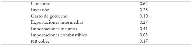 Finalmente, para mejorar el ajuste del modelo macro se supuso que existen rezagos en las respuestas de la demanda de todos los insumos en el sector de bienes intermedio y de cobre. De esta manera, la demanda por un insumo genérico j que se denomina insumoJ,t (“log linealizada”), además de depender positivamente del nivel de producciónt y negativamente del precio del insumo, expresado en términos reales, el cual se denomina ρJ,t y también depende de un rezago insumoJ,t-1. Además, los precios responden menos de lo esperado al ponderarse por un parámetro ςj. Todos estos parámetros de ajustes son estimados.