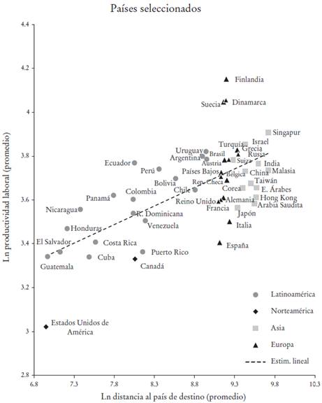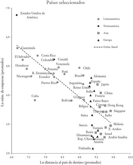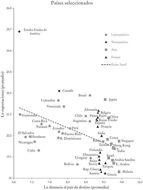 Los datos del Cuadro 1 también exhiben desigualdades en las exportaciones: la media parece ser más baja en los destinos más lejanos. Esto se percibe claramente si se compara el área compuesta por los Estados Unidos y Canadá con respecto a los países que componen la región de Latinoamérica o Europa. En el primer caso, se obtiene una media en el logaritmo de las ventas al exterior de 12.70; por su parte, para Latinoamérica se tiene un promedio de 10.97 y para Europa de 10.80. De la inspección visual de la información presentada en la Gráfica 3 se observa que esa relación inversa, entre exportaciones y distancia a los países de destino, se mantiene cuando se utilizan datos más desagregados.