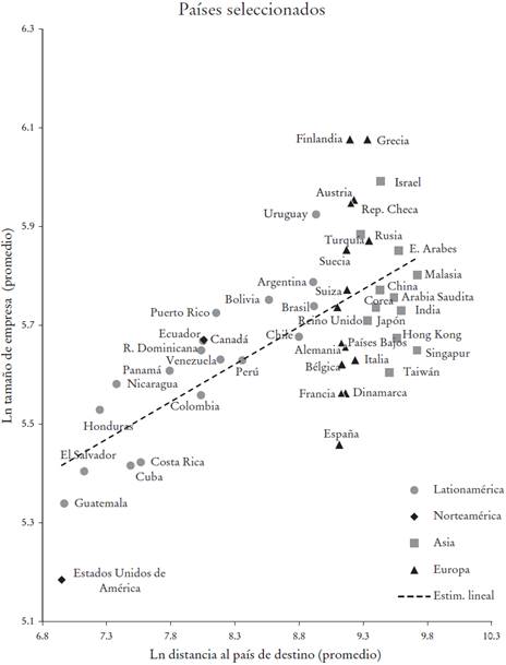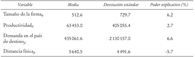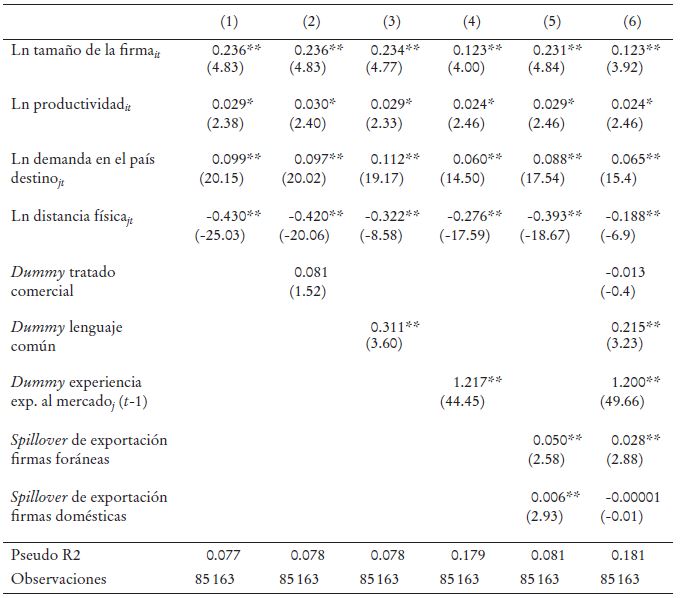 En suma, las firmas exportadoras tienen más posibilidad de vender en mercados con una alta demanda por bienes foráneos. También existe más probabilidad de elegir como mercados de destino a países con los que se comparta un lenguaje común o con los cuales se tengan una relación comercial continua. Los costos de transporte limitan la posibilidad de arribar a zonas económicas más lejanas; no obstante, aumentos en tamaño y productividad laboral incrementan la probabilidad de llegar a un número más grande de países.