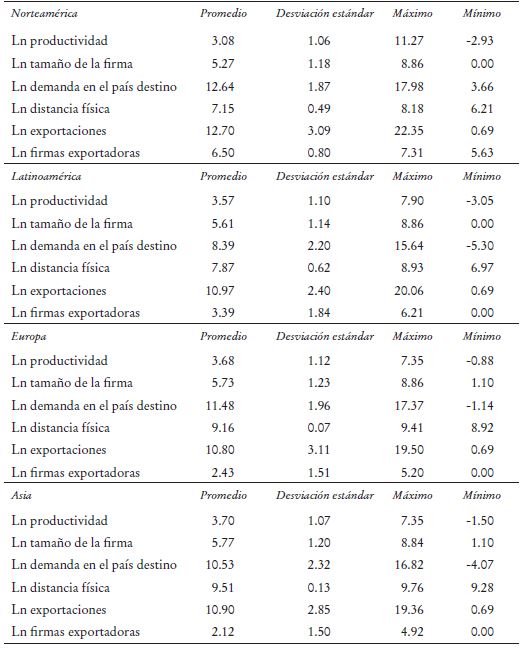 La base de datos final comprende 3 524 empresas que exportaron al menos a uno de los 191 posibles países de destino durante el periodo 2004-2010 y representa un panel desbalanceado por los cruces imperfectos con las variables incluidas.