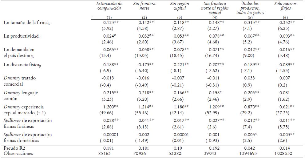 Para atender este asunto, se construyó una nueva variable dependiente con una base de datos “ampliada” que abarca todos los productos y destinos de exportación de las firmas. Con este cambio de variable, los resultados obtenidos (quinta columna) son similares en signo y significancia a los informados previamente. La mayor parte de las covariables no muestra grandes cambios en su magnitud, salvo en las variables que refieren a las características de las firmas; esto último puede obedecer a que tales coeficientes reflejan el mayor esfuerzo en productividad y tamaño que deben hacer las firmas para llevar más productos a más destinos, como lo establecen los modelos de firmas heterogéneas multiproducto (Eckel y Neary, 2010; Arkolaki et al., 2014; Mayer et al., 2014)