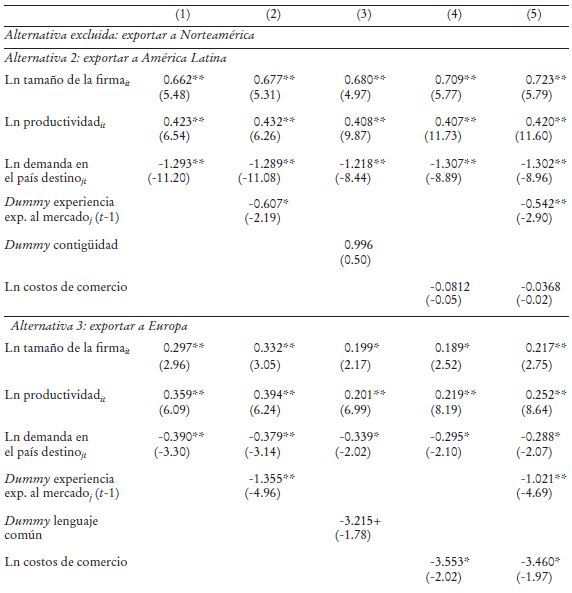 Para evaluar la segunda predicción, la variable dependiente toma únicamente los valores positivos de Eijt; con ella se construye otra variable que considera cuatro posibles elecciones que puede tomar la firma, mismas que son examinadas en función de distintas características de la empresa y del mercado de destino. La categoría de comparación es vender al área de Norteamérica, y las siguientes tres alternativas son exportar a Latinoamérica, Europa o Asia.
