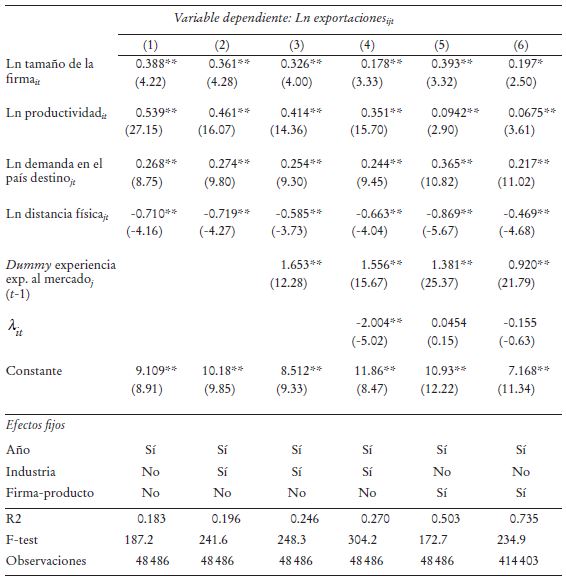 En esta sección se presentan los coeficientes estimados derivados de la evaluación empírica de las cuatro predicciones emanadas del modelo teórico. Como punto de partida se examinaron los factores que influyen en las decisiones de exportación de las empresas; posteriormente se analizó por qué las firmas eligen un destino sobre otro, para finalmente estudiar los elementos que inciden en las ventas y la cantidad de exportadores hacia un mercado en particular.