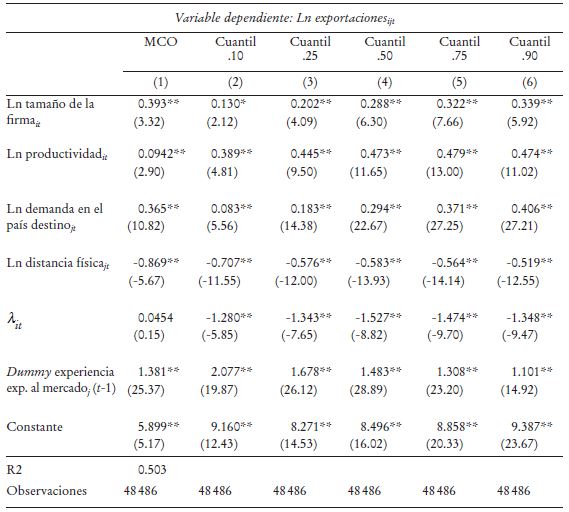 A pesar de que en la quinta columna del Cuadro 6 se tiene una estimación que controla diversos aspectos relevantes para evaluar empíricamente la hipótesis referente a las ventas de exportación de las firmas, esta aproximación sólo proporciona una visión parcial de la relación entre las ventas al exterior y las características de la firma, así como las del mercado de exportación. La razón es que el método de mínimos cuadrados ordinarios resume dicha relación con base en una media condicional. Se lograría un panorama más completo en la evaluación al conocer el posible efecto asimétrico que tienen las covariables utilizadas en diferentes puntos de la distribución de la variable dependiente.
