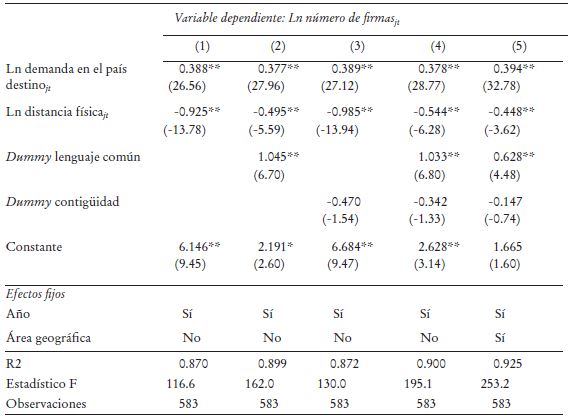En la segunda columna se incorporó la variable dummy de lenguaje común entre México y el país de destino de las exportaciones de las firmas. La inclusión de esta covariable indica que el hecho de compartir un idioma semejante entre el país exportador y el importador incrementa el número de firmas a ese destino, ya que un idioma común contribuye a disminuir los costos relacionados con la transacción de mercancías. En la tercera columna se incluyó una variable dummy que capta la contigüidad entre el país exportador y el de destino, el coeficiente obtenido refleja no ser significativo. La cuarta columna incorpora las dos variables dummies previas; los resultados computados no son tan diferentes a los registrados en la segunda columna.