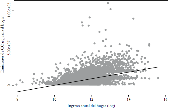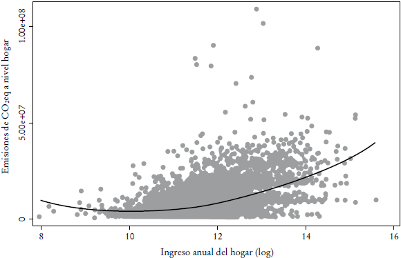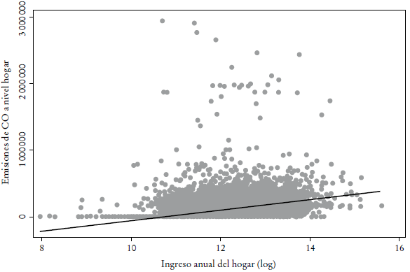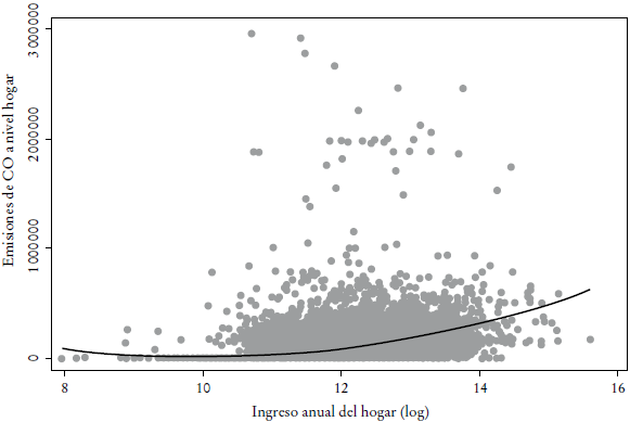 En los hogares, los individuos tienen un conjunto de decisiones que tomar en relación con el transporte y su consiguiente impacto en emisiones, que empiezan por i) el modo de transporte por utilizar (caminar, usar bicicleta, transporte público, transporte público masivo o vehículo particular); ii) la elección de usar transporte privado, pues se tendrá que elegir el número de vehículos por poseer y el tipo de vehículo por conducir, y finalmente iii) la distancia que media entre el hogar y el centro de actividad principal. Es claro que el costo social de manejar es mayor que el costo privado. Sin embargo, de acuerdo con la hipótesis de la EKC, es probable que los hogares más ricos se encuentren en una mejor posición para internalizar estos costos sociales. Esto quiere decir que, en teoría, los hogares con mayor ingreso pueden vivir más cerca de sus centros de actividad económica y, por tanto, los individuos pueden caminar o andar en bicicleta hasta ellos, o comprar autos más nuevos con menores emisiones que, por ende, contaminan menos. Los hogares con menos ingresos contaminarían más por el uso de vehículos más antiguos y por el hecho de encontrarse más lejos.