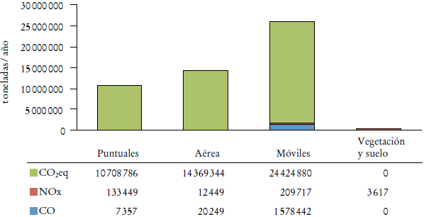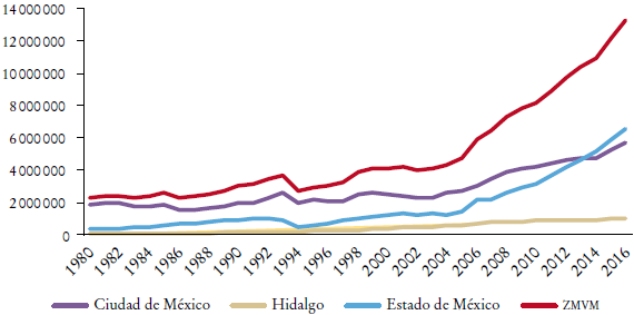 La ZMVM está conformada por las 16 delegaciones de la Ciudad de México, 59 municipios del Estado de México y un municipio de Hidalgo. En la ZMVM los vehículos automotores son la fuente más importante de generación de emisiones de CO y NOx (véase la Gráfica 4). Con más de 21 millones de habitantes y 245 vehículos por cada 1 000 habitantes, la ZMVM cuenta con una de las flotas vehiculares más grandes del país, con tasas de crecimiento alarmantes (Conapo, 2012). El número de autos registrados en la ZMVM prácticamente se duplicó en ocho años (2005-2013), al pasar de 3.5 millones a 6.8 millones (véase la Gráfica 2). En décadas anteriores, este fenómeno había tardado 25 años en suceder (1980-2005).