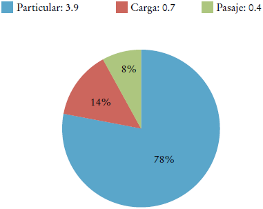 De acuerdo con el último Inventario de Emisiones Contaminantes y Gases de Efecto Invernadero 2012 que publica la Secretaría del Medio Ambiente de la Ciudad de México (Sedema-CDMX, 2013), del parque vehicular en la ZMVM, compuesto por cinco millones de vehículos aproximadamente, 78% de los vehículos es particular (véase la Gráfica 3). Del total de vehículos, 94% utiliza gasolina, 5% consume diésel y 1% gas LP. Del parque vehicular que utiliza gasolina, 52% es anterior a 1990, carece de tecnología ambiental, es altamente emisor y aporta cerca de 68% de las emisiones totales. El restante 48% de los vehículos pertenece a 1991 o en adelante y cuenta con tecnología ambiental. Sin embargo, aún participa con 32% de las emisiones.