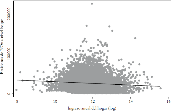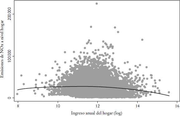 A nivel microeconómico, entre los pocos análisis empíricos existentes están el de Kahn (1998), quien estudió las emisiones del transporte en California al respecto de los hogares, con un método de cálculo indirecto que presentó evidencia de una U invertida no monotónica tipo EKC entre las emisiones y el ingreso, cuyo punto de inflexión se halló en 35 000 USD en el ingreso anual promedio del hogar. Los resultados de este estudio son consistentes con la proposición teórica propuesta por Pfaff et al. (2004), en la que desarrollaron un modelo teórico de producción de los hogares, según el cual los más ricos no pueden comprar directamente calidad ambiental, pero pueden contribuir a la reducción de la degradación, adquiriendo bienes con menor impacto ambiental. En contraste, Cox et al. (2012) usaron información más reciente e indicadores adicionales en un estudio empírico para hogares en California y mostraron una relación lineal positiva entre emisiones e ingreso. Su estudio sugiere que, a pesar de que las familias más ricas compran autos menos contaminantes, los manejan en menor medida, pues también poseen vehículos viejos, que igualmente manejan y, en términos absolutos, manejan más. Finalmente, Giovanis (2013), en un análisis reciente para el Reino Unido, usó información de la encuesta de panel británica entre 1991 y 2009 y concluyó que no existe una relación estilo EKC cuando se consideran ingresos del hogar, lo que sugiere que la política pública tiene mayor relevancia que las acciones individuales espontáneas.