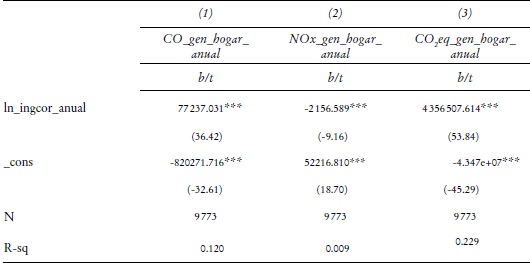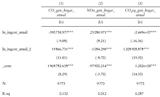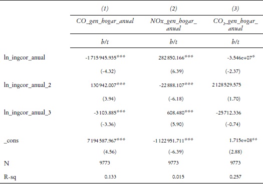 Metodología: Se corrió un modelo de mínimos cuadrados ordinarios (MCO) lineal, cuadrático y cúbico del modelo típico de Kuznets para conocer la relación existente entre el ingreso y las variables de contaminación atmosférica. Se construyó una base de datos con información de 2010, 2012 y 2014, con datos del Módulo de Condiciones Socioeconómicas (MCS) del Instituto Nacional de Estadística, Geografía e Informática (INEGI) para una muestra representativa de 1 582 hogares, con datos de ingreso anual e ingreso per cápita por hogar, así como sobre la ubicación del hogar, el número y modelo de los vehículos que éste posee y un estimado propio sobre distancias recorridas, para ponderar las emisiones con el modelo MOVES-México, que utiliza las mediciones de monitoreo atmosférico existentes en la Zona Metropolitana del Valle de México (ZMVM).