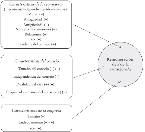 Considerando estas relaciones, en la Figura 1 se presentan las variables que utilizaremos para explicar la remuneración de los miembros del consejo y el signo esperado de dicha relación.