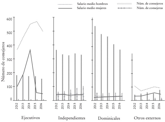 Resultados: Desde los consejeros ejecutivos se percibe tanto mayor ausencia de mujeres como mayor diferencia salarial. Afortunadamente, esta brecha salarial no se percibe en las otras categorías de consejeros analizadas, esto es, independientes y dominicales. Asimismo, aunque es cierto que la presencia de mujeres en estas categorías, esto es, independientes y dominicales, es más elevada, los resultados muestran una escasa incorporación.