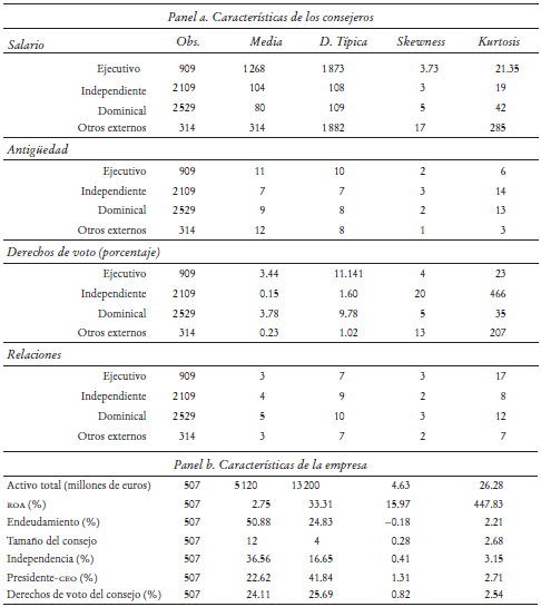 En el Cuadro 1 presentamos los estadísticos descriptivos de las principales variables empleadas tanto en consejeros (panel a) como en consejos y empresas (panel b). Por otra parte, en la Gráfica 1 se muestra, diferenciada por la tipología del consejero, la evolución temporal tanto en el número de consejeros como en su salario medio.