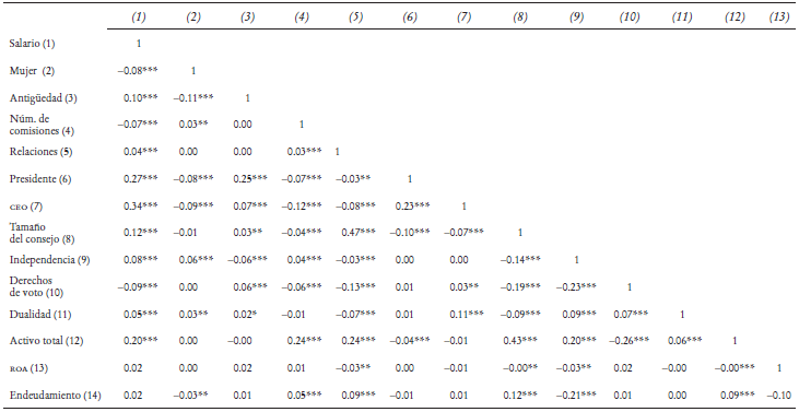 Adicionalmente, en el Cuadro 2 presentamos la matriz de correlación entre las variables que posteriormente utilizaremos para explicar el nivel salarial de los consejeros. Como se puede apreciar, no observamos niveles de correlación que nos hagan pensar en problemas de multicolinearidad entre las variables.