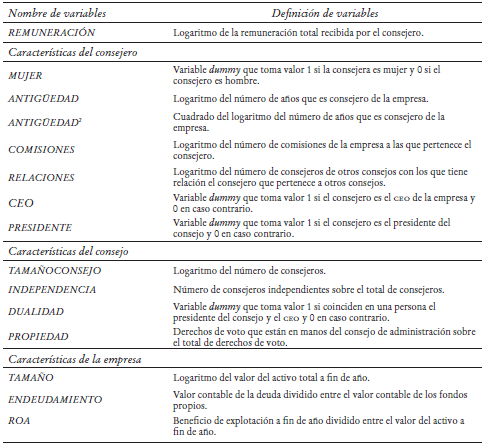 En este modelo, estimado para cada tipo de consejero (ejecutivo, independiente y dominical), la variable dependiente es la remuneración percibida por el consejero, REMUNERACIÓN, calculada como el logaritmo de la remuneración percibida por cada consejero. Los determinantes de la remuneración o variables independientes que hemos utilizado son, como ya comentamos al abordar el marco teórico ( Gráfica 1), por un lado, aquellos que determinan las características del consejero: MUJER, aproximada por una variable dummy que toma valor 1 si la consejera es mujer y 0 si el consejero es hombre; ANTIGÜEDAD, calculada como el logaritmo del número de años que ha sido consejero; ANTIGÜEDAD2, el cuadrado del logaritmo del número de años que ha sido consejero; COMISIONES, calculada como el logaritmo del número de comisiones del consejo a las que pertenece; RELACIONES, calculada como el logaritmo del número de consejeros con los que tiene relación por su pertenencia a otros consejos; CEO, dummy que toma valor 1 si el consejero es el CEO de la empresa y 0 en caso contrario, y PRESIDENTE, dummy que toma valor 1 si el consejero es el presidente del consejo y 0 en cualquier otro caso. Se incluyen también variables representativas de las características del consejo: TAMAÑOCONSEJO, calculada como logaritmo del número de personas que forman el consejo de administración; INDEPENDENCIA, obtenida mediante el cociente del número de consejeros independientes entre el total de consejeros; DUAL, dummy que toma valor 1 si las funciones de CEO y presidente del consejo recaen en la misma persona y 0 en caso contrario, y PROPIEDAD, calculada por el cociente de los derechos de voto en manos del consejo entre el total de derechos de voto de la empresa. Respecto de las variables de control de la empresa hemos considerado: ROA, como medida de performance de la empresa y calculada como el beneficio antes de intereses e impuestos respecto del activo total a final de año; ENDEUDAMIENTO, calculada como el cociente entre la deuda total y el activo total a fin de año, y TAMAÑO, calculada como el logaritmo total del activo de la firma a fin de año. En el Cuadro 3 se recoge la definición de las variables incluidas en el estudio.