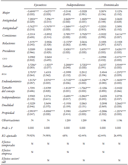Es posible que las diferencias observadas estén determinadas por factores diferentes al género, como la pertenencia o no a comités, la antigüedad o el desempeño de cargos como CEO o presidente del consejo. Por ello, realizamos un análisis más detallado de los determinantes de la compensación recibida por el consejero para la muestra que ha incorporado la diversidad en el consejo, esto es, empresas que tienen tanto consejeros como consejeras para desarrollar las mismas funciones en cada una de las categorías analizadas -ejecutivos, independientes y dominicales-. Para realizar el análisis se ha procedido a la estimación de los parámetros de la ecuación (1) por mínimos cuadrados ordinarios con errores robustos y se ha ajustado por efectos fijos temporales y de la empresa o del sector. Los resultados se presentan en el Cuadro 6.