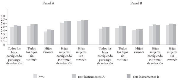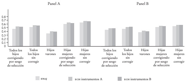 Como puede apreciarse, tanto en el caso de la EII como en el de la IRA, las estimaciones que utilizan la fuente de información ENAJ son menores que las realizadas mediante la ECH, lo cual podría ser por el sesgo por corresidencia presente al utilizar esta última fuente de datos. A la vez, la estimación a partir del conjunto de instrumentos B no cambia significativamente los resultados, lo cual podría indicar que los instrumentos A son adecuados para la predicción del ingreso laboral de los padres.