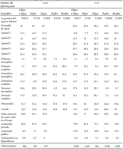 El Cuadro A1 (del apéndice) resume algunas características de las muestras a partir de los promedios de las variables a considerar en el análisis empírico. Se cuenta con 826 casos en la ENAJ (407 hijos varones y 419 hijas mujeres de 25 a 29 años), mientras que con la ECH el número de observaciones asciende a 2 026: los varones son 1 165 y las mujeres 861.