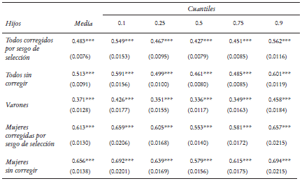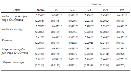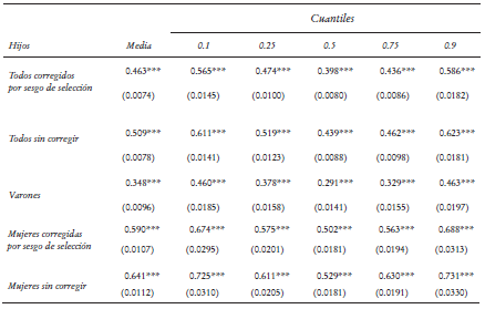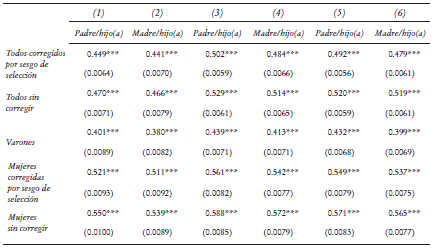 En todas las estimaciones al corregir por sesgo de selección en el empleo se obtienen una EII y una IRA menor. Las diferencias son estadísticamente significativas, lo cual indica que de no tener presente este sesgo se subestima la MSI del ingreso. Sin embargo, contrario a lo hallado por Cervini (2009) para España, la corrección de este sesgo no elimina las diferencias significativas que existen entre los hijos y las hijas, siendo estas últimas las que presentan una MSI de ingresos más baja en todos los casos.