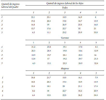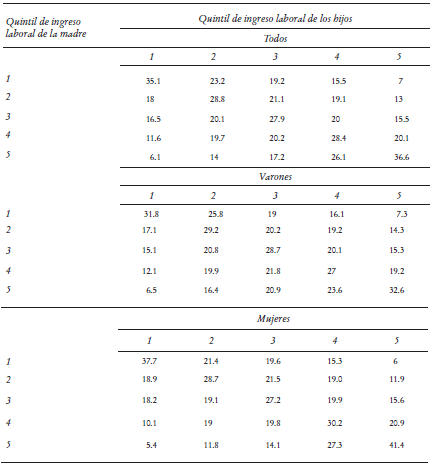 El Cuadro A12 del apéndice presenta las matrices que vinculan el ingreso laboral de todos los hijos, de los varones y de las mujeres, respectivamente, con el ingreso laboral de los padres; utilizan como muestra principal la fuente de información ENAJ. El Cuadro A13 reporta la misma información pero considera el ingreso laboral de las madres.14