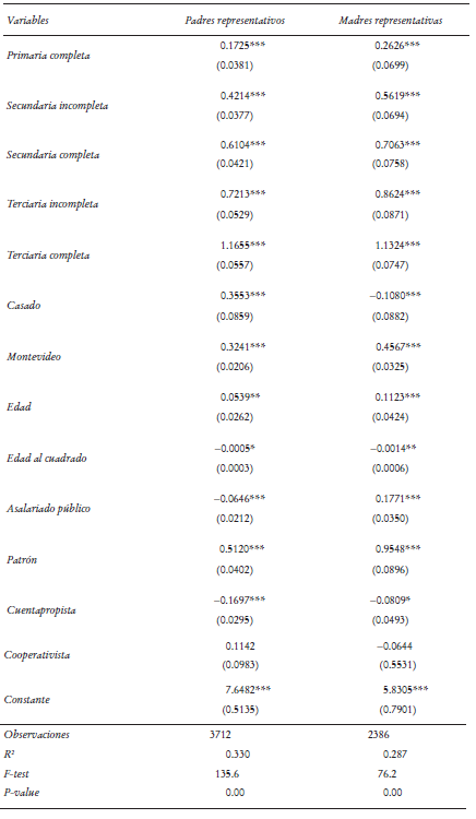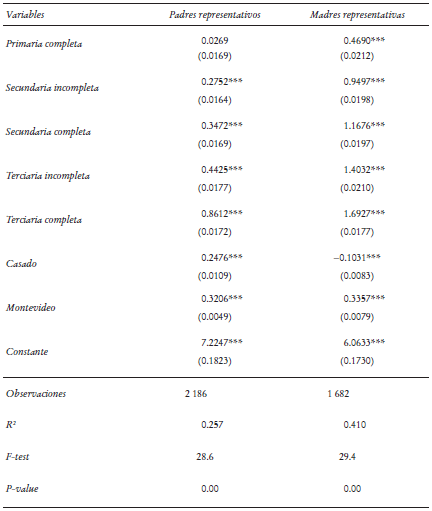 Al comparar los coeficientes referidos a la IRA, se observa que éstos son mayores a los resultados hallados por Dahl y De Leire (2008) y Chetty et al. (2014a y 2014b) para los Estados Unidos. Estos autores estiman un β cercano a 0.3. Asimismo, la IRA para Uruguay resulta levemente superior a la estimada por Jiménez (2011) para Argentina (0.41 al considerar el ingreso del padre y 0.38 al considerar el ingreso de la madre).