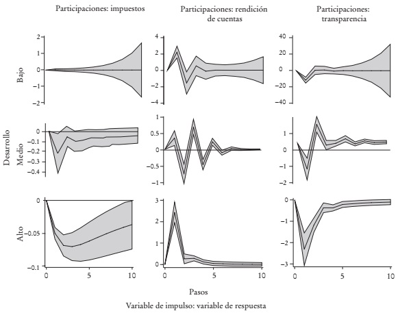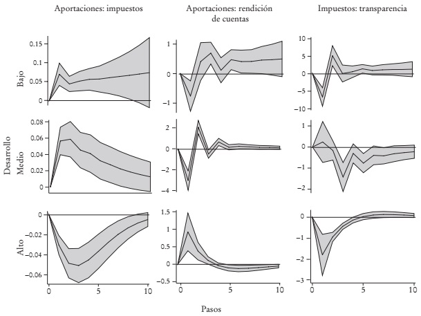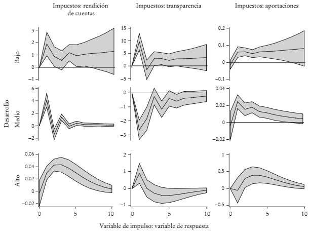 El nivel promedio condicional alcanzado por los indicadores de rendición de cuentas y transparencia, tomando en cuenta el impacto simultáneo de las variables en el sistema, disminuye con el desarrollo económico. Del análisis impulso respuesta encontramos evidencia a favor de que las transferencias federales (participaciones y aportaciones) incitan la pereza recaudatoria de los gobiernos locales, sobre todo de aquellos con mayor desarrollo económico. Esto refuerza la idea de que los funcionarios públicos consideran que el costo político es más alto que el costo económico de no recaudar, por lo que los funcionarios públicos prefieren desperdiciar el potencial de ingresos recaudables (Weingast, 2014). En los estados de más bajo desarrollo económico las aportaciones tienen un efecto negativo inicial, tanto sobre la rendición de cuentas como sobre la transparencia.