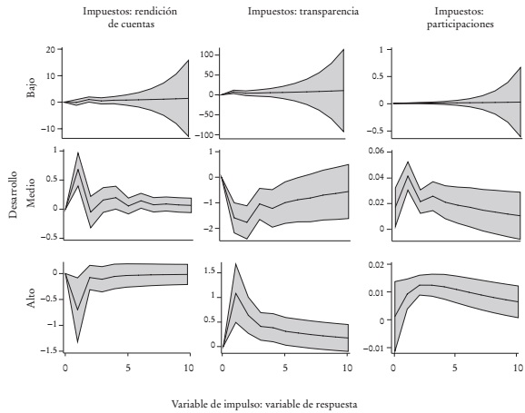 La Gráfica 1 presenta la respuesta de la recaudación local (impuestos), de la rendición de cuentas y la transparencia de los estados a choques ortogonales provenientes de las participaciones per cápita por nivel de desarrollo (una gráfica similar se presenta en el apéndice A1, que muestra el caso de las aportaciones).