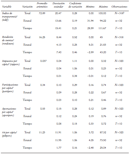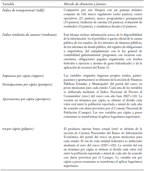 Obtenemos datos anuales para el periodo de 2003 a 2013 sobre transferencias federales de la página de la Secretaría de Hacienda y Crédito Público (SHCP), del producto interno bruto (PIB) y de la población del Instituto Nacional de Estadística y Geografía (INEGI). Los indicadores de ingresos estatales se obtienen de la calificadora de riesgo Fitch Ratings. Los indicadores de transparencia y de rendición de cuentas se obtienen del Índice de Transparencia y Disponibilidad de la Información Fiscal de las Entidades Federativas (ITDIF) en México de la empresa consultora ARegional.