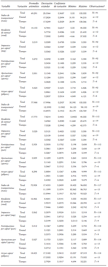 La muestra en este estudio consiste en un panel con 32 estados para 10 años en promedio, lo que suma 320 observaciones. Los indicadores de transparencia y rendición de cuentas no reportan valores para todos los casos, por ejemplo, Guerrero en 2006. Con el fin de examinar si el nivel de desarrollo tiene implicaciones sobre la relación dinámica entre las transferencias federales, la rendición de cuentas y los ingresos propios, empleamos tertiles de PIB per cápita para clasificar a los estados como bajo, medio y alto nivel de desarrollo económico (ingreso). La estadística descriptiva para la muestra completa y para cada nivel de ingreso se presenta en los Cuadros 2a y 2b, respectivamente.