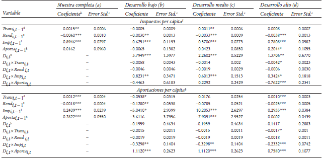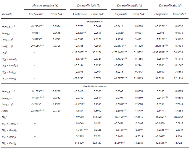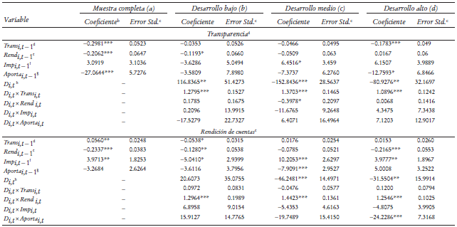 El interés de este documento es examinar el efecto de las transferencias federales sobre la transparencia, la rendición de cuentas y la capacidad de generar ingresos propios. De la misma forma, buscamos corroborar si el esfuerzo fiscal está asociado con mayor transparencia y rendición de cuentas. Con el fin de tener un primer acercamiento a estos efectos, ahora observamos los estimadores asociados a las variables dummy multiplicativas Di,t× Transi,t, Di,t× Rendi,t, Di,t× Impi,t y Di,t× Parti,t en distintos niveles de desarrollo económico. Las participaciones y aportaciones no se asocian de manera contemporánea con la transparencia. La única excepción es el efecto positivo de las participaciones en los estados con nivel de desarrollo medio (véase renglón Di,t× Parti,t en el primer panel de resultados del Cuadro 3a).