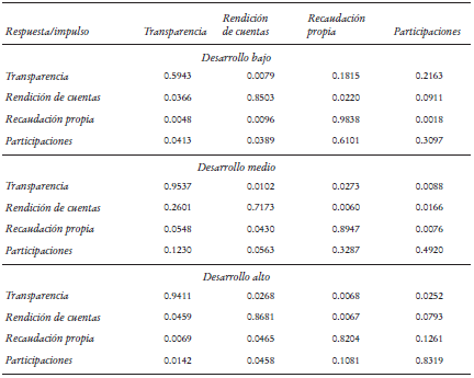 Con el fin de examinar las fuentes de variación de cada variable en el sistema, el Cuadro 4 presenta el pronóstico a cinco pasos de la descomposición de varianza de nuestro VAR(1). Para los estados de bajo desarrollo se observa que una proporción importante de la varianza de la transparencia proviene de impulsos de recaudación propia (18.15%) y de impulsos de participaciones federales (21.63%). Para los estados de desarrollo medio y alto estas proporciones se diluyen y la variación de la transparencia depende casi en su totalidad de impulsos provenientes de sí misma.