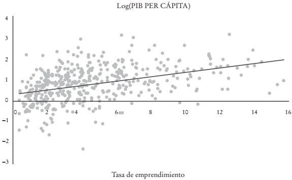 Sin embargo, la mayoría de las investigaciones se han enfocado exclusivamente en el análisis del emprendimiento como determinante de la actividad económica. En ese sentido, existen artículos que han encarado la relación del emprendimiento con la generación de empleo regional, mediante metodologías de series de tiempo (Audretsch y Thurik, 2001; Baptista, Madruga y Escaria, 2008), o que han analizado la relación entre la tasa de emprendimiento y el producto per cápita o su tasa de crecimiento (Braunerhjelm y Borgman, 2004; Stam, Suddle, Hessels y Van Stel, 2007; Van Stel, Carree y Thurik, 2005; Li, Yang, Yao, Zhang y Zhang, 2012; Urbano y Aparicio, 2016). Asimismo, el emprendimiento y el ingreso per cápita es abordado como una relación de largo plazo que posee forma de U (Carree, Van Stel, Thurik y Wennekers, 2002; Wennekers, Van Stel, Thurik y Reynolds, 2005; Wennekers, Van Stel, Carree y Thurik, 2010). Estas últimas investigaciones indican que las tasas de emprendimiento al principio tienen una relación negativa con el estado de desarrollo (visto a través del ingreso per cápita), y posteriormente esa relación se convierte en positiva. Otros enfoques alternativos son Noseleit (2012), quien halla efectos positivos del emprendimiento sobre el crecimiento económico a partir del cambio de la estructura productiva, y Beugelsdijk (2007), quien encuentra que las diferencias entre el crecimiento de las regiones europeas se explica por diferencias en la cultura de emprendimiento. Mientras que otra serie de estudios ha utilizado el nivel de actividad económica o la tasa de crecimiento como determinante del emprendimiento dentro de un enfoque unidireccional (Van Stel, Storey y Thurik, 2007; Klapper, Amit, Guillén y Quesada, 2007; Thai y Turkina, 2014; Castaño, Méndez y Galindo, 2015).