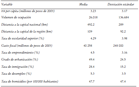 Ahora bien, al momento de especificar un modelo empírico sobre la relación dual entre desarrollo regional y emprendimiento, se hace necesario establecer un conjunto de factores que puedan operar como variables de control de uno u otro elemento. En el presente estudio se utilizan como otros determinantes del nivel de desarrollo regional variables tradicionales, como el capital humano (Lucas, 1988), el gasto fiscal (Keynes, 1936), la localización, tomada mediante la distancia entre el municipio y la capital del país, así como la distancia con la capital regional (Clark, 1951; Small y Song, 1994; Martori y Surinach, 2002; Duran y Vallejo, 2015). Mientras tanto, para el caso del emprendimiento se emplean variables de control como el nivel de urbanización, ciudades más urbanizadas favorecen la actividad emprendedora debido a la mayor circulación de conocimiento, innovación y encadenamientos productivos (Stam, 2009); la inmigración (Poot, 2007) y el nivel cosmopolita del sistema social (Rogers, 1962), en las ciudades con alta inmigración de capital humano se genera un “efecto interacción” entre los locales y los extranjeros que facilita la difusión de ideas y de patrones culturales, entre ellos la cultura del emprendimiento; la tasa de desempleo, como elemento que puede erosionar el autoempleo por necesidad en el “efecto refugio” (Evans y Jovanovic, 1989; Thurik et al., 2008); los factores institucionales asociados con la seguridad y el orden jurídico (North, 1990; Acemoglu, Johnson, Robinson y Thaicharoen, 2003), tomado en este caso a partir de la tasa de homicidios, ya que altas tasas de muertes violentas reflejan la baja eficacia y capacidad de las instituciones para hacer justicia y generar un ambiente de estabilidad social.