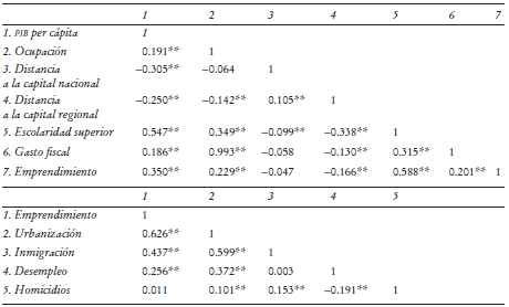 Por su parte, el emprendimiento presenta una correlación positiva y significativa con urbanización, inmigración y tasa de desempleo. No tiene correlación con el número de homicidios.