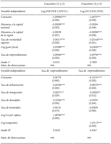 Como forma funcional se emplea la semi-log con el fin de facilitar la interpretación de los coeficientes; en el caso de la ecuación (1), la expresión del PIB PER CÁPITA en log implicará que el coeficiente que acompaña la variable de emprendimiento pueda interpretarse como una semielasticidad, en vez de emplear una forma lineal, ya que el coeficiente sería entonces un efecto marginal. Dado que el PIB PER CÁPITA está medido en millones de pesos y los municipios presentan alta heterogeneidad en dicha variable, se hace más comprensible la lectura del coeficiente como una semielasticidad. En la ecuación (2) se emplea la variable de emprendimiento en niveles y el PIB per cápita en la forma log, dado que así es como se expresaron en la ecuación (1), y se desea mantener la coherencia de estas variables en ambas ecuaciones simultáneas. Asimismo, en la ecuación (2) no se incluye algún rezago de la variable PIB PER CÁPITA, dado que no fue posible contar con información para construir adecuadamente dichos valores, y que en la investigación se aplica un modelo de corte transversal en el cual no se toman en cuenta efectos temporales. La muestra corresponde a 444 municipios analizados en 2005.