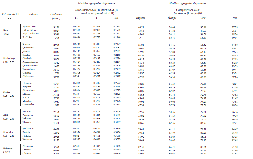 En contraste, tenemos a las entidades cuya condición de ciudadanía promedio es casi de primer mundo (estrato de HI baja): Nuevo León, Ciudad de México, Baja California Norte y Baja California Sur. Si bien aún presentan algunos rezagos en materia de DESC, la HI es menor que 0.2, producto de valores de H entre 0.55 y 0.66, e intensidades entre 0.24 y 0.29. La HI de Nuevo León, la más baja, 0.1492, es 3.3 veces menor que la de Chiapas, en el otro extremo. Su valor de I (0.2434) ubica al estado en la pobreza moderada. Lo mismo ocurre si observamos las incidencias de las pobrezas parciales: en la Ciudad de México, cuatro de cada 10 habitantes tiene un ingreso por debajo de la LP-MMIP, mientras que en Chiapas nueve de cada 10 y en Guerrero y Oaxaca ocho de cada 10 se encuentran en esta situación (Cuadro 8).