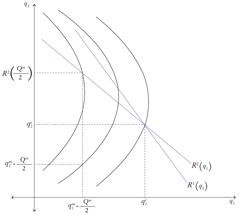 Con el ejemplo de Rey y Tirole podemos explicar el problema del compromiso. Suponga que un monopolio aguas arriba enfrenta un duopolio aguas abajo que compite en cantidades y desea extraer el mayor rendimiento de su producto, lo que genera el precio más alto posible en el mercado aguas abajo y fija una tarifa en dos partes, en la que hay un precio de transferencia y un cargo fijo. El precio de transferencia puede ser un precio determinado v y después puede cobrar un cargo fijo igual a πm/2, ofreciendo a cada uno de los dos productores una cantidad que les permite producir un nivel Qm/2.2 Con estos cargos, el monopolista podría obtener los beneficios monopólicos en el mercado aguas abajo. Supongamos que después de firmado el acuerdo con cada una de las empresas del duopolio aguas abajo, las dos deciden firmar en privado un acuerdo en el que la primera cobra el mismo cargo por unidad v a la segunda, pero ahora le ofrece lo suficiente para producir R2(Qm/2) y le cobra un cargo fijo igual a π2 (Qm/2, R2 (Qm/2)). La empresa que recibe la oferta (la segunda empresa) aceptaría la nueva; sin embargo, la primera acabaría perdiendo debido al contrato que firmó inicialmente. Esto hace que la primera empresa no acepte el contrato de inmediato. En la Gráfica 1 se ilustra la situación con las correspondientes gráficas de isobeneficio, que ejemplifican cómo es conveniente firmar el contrato que lleve a la segunda firma a producir R2(Qm/2), y se muestra cómo las curvas de isobeneficio correspondientes a (Qm/2, Qm/2) son mayores que las del equilibrio no cooperativo de Nash (ilustrado con (qc, qc)). Asimismo, la curva de isobeneficio que cruza el punto (Qm/2, R2 (Qm/2)) representa un beneficio más alto para la empresa que se desvía (la segunda).