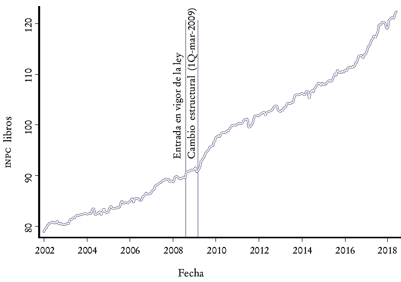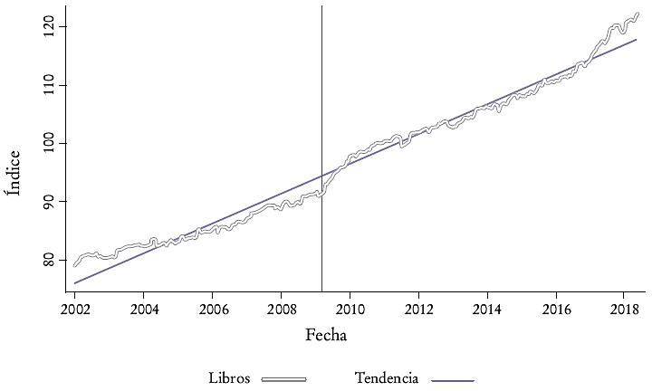 La Gráfica 2 demuestra que la tendencia de los precios de los libros es ascendente. Esto no es sorpresa. Sin embargo, lo que buscamos mostrar en este trabajo es que a partir de la emisión de la ley los precios cambiaron su trayectoria. Con este objetivo en la Gráfica 3 ilustramos un ajuste de tendencia que cambia en marzo de 2009, poco tiempo después de la emisión de la ley (julio de 2008). El efecto ocurre con un poco de retraso, debido a que los libros afectados fueron los nuevos (nuevas ediciones). Este proceso lleva tiempo a medida que se editan nuevos libros. No obstante, una vez que se manifiesta, el impacto es fuerte y sigue acumulándose a lo largo del tiempo, incluso en los datos más recientes con los que se cuenta (mayo de 2018).