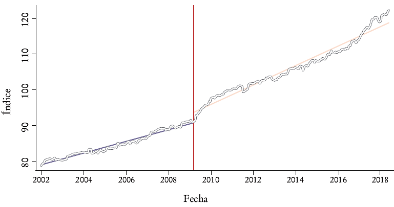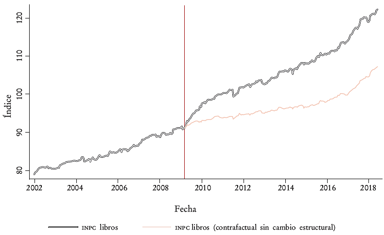 Nuestra muestra abarca desde la primera quincena de enero de 2002 hasta la segunda de mayo de 2018. De aquí en adelante se analiza el cambio estructural en los precios considerando que los cambios (el cambio estructural) inician desde la segunda quincena de marzo de 2009. En realidad la ley entró en vigor a finales de 2008, probablemente como consecuencia de contratos de largo plazo (contratos anuales, por ejemplo) o por los argumentos vertidos con anterioridad en el sentido de que la ley abarca únicamente a las nuevas ediciones y que el impacto se siente conforme salen nuevas emisiones al mercado. El índice de precios de otros libros contiene información de nuevas ediciones y de ediciones pasadas, por lo que el impacto tardará un tiempo en verse reflejado. Es natural observar un rezago en el impacto; fue hasta 2009 cuando el nivel de precios comenzó a tomar una pendiente distinta. El objetivo es mostrar cómo después de la publicación de la ley en el Diario Oficial de la Federación en julio de 2008 ocurrió un cambio estructural en la tendencia de precios.