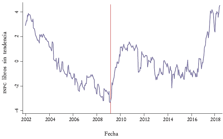 La Gráfica 5 es significativa respecto del impacto que tuvo la ley sobre los precios de los libros. Como se ve en la Gráfica 2, éstos suben constantemente. Sin embargo, al quitarle la tendencia podemos identificar si ese crecimiento cambió después de la emisión de la ley. El cambio se puede ver en la Gráfica 5. Ahí vemos cómo, después de la emisión en julio de 2008, la tendencia de crecimiento en precios de los libros se revirtió. Aunque los precios estaban aumentando (véase Gráfica 1), la Gráfica 5 muestra que, hasta marzo de 2009, este aumento era decreciente. Después de este periodo se alcanza el mínimo de crecimiento y se dispara hacia arriba. El salto significativo en el crecimiento de precios es claramente observable en la Gráfica 4.