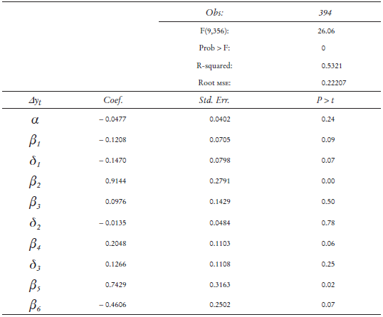 Se realizaron las pruebas pertinentes postestimación. Se probó si efectivamente los residuales son ruido blanco.17 Se confirmó que los residuales sí se comportan como ruido blanco. Adicionalmente, se hizo la prueba de efectos ARCH,18 pero no encontramos evidencia. Consideramos que, dadas estas pruebas, nuestros estimadores son objetivos y consistentes.