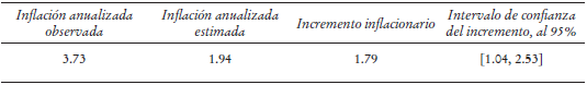 De acuerdo con la metodología de Aradillas (2015), a partir de nuestros estimadores obtenemos la inflación anualizada observada y aquella que hubiéramos esperado observar, y a partir de ahí se genera un estimador del incremento inflacionario derivado de la ley, que servirá para calcular el daño al bienestar del consumidor. Como es un estimador complejo, de la misma manera se obtuvo un estimador de la varianza de aquél, conforme el “método delta”.
