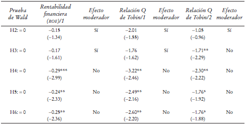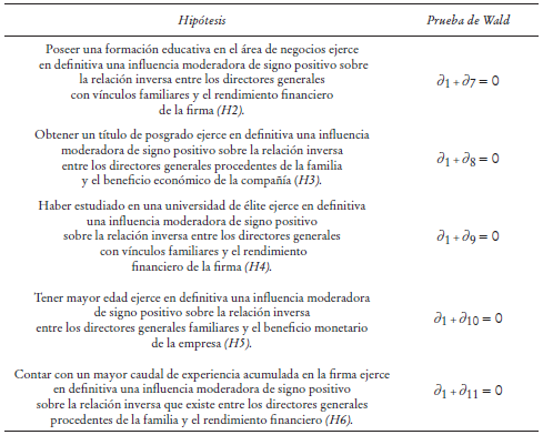 Los efectos moderadores de signo positivo que, según las expectativas, deben tener sobre la rentabilidad de la corporación las variables correspondientes a las habilidades mostradas por los directores generales con ese perfil se corroboraron mediante las pruebas de Wald. Específicamente, se sometieron a verificación las hipótesis asentadas en el Cuadro 3.