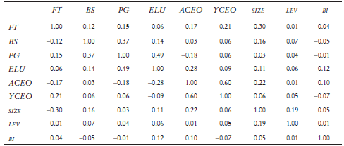 Las correlaciones más fuertes se dan entre la edad del director general (ACEO) y la cantidad de años que lleva en la firma (YCEO); entre la educación adquirida en una universidad de élite (ELU) y los estudios de posgrado (PG), y entre los estudios en el área de negocios (BS) y los estudios de posgrado (PG). Sin embargo, en todos los casos los factores relativos a la inflación de la varianza suman menos de 10. El valor más elevado se observa en ACEO (6.67), seguido por Lev (6.54), YCEO (6.20), Size (3.65), PG (3.38), BS (3.25), FT (2.52), BI (2.40), ELU (2.06); por consiguiente, la multicolinealidad no requiere un tratamiento posterior.
